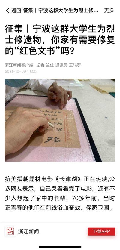 【浙江新闻】宁波财经学院这群大学生为烈士修遗物