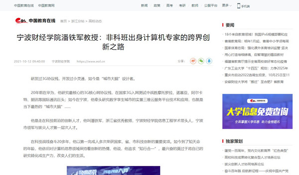 【中国教育在线】宁波财经学院潘铁军教授:非科班出身计算机专家的跨界创新之路
