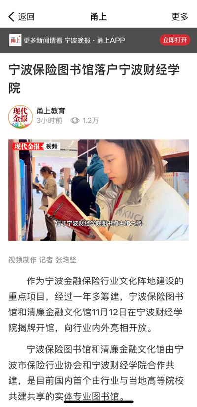 【宁波晚报甬上客户端】宁波保险图书馆落户宁波财经学院