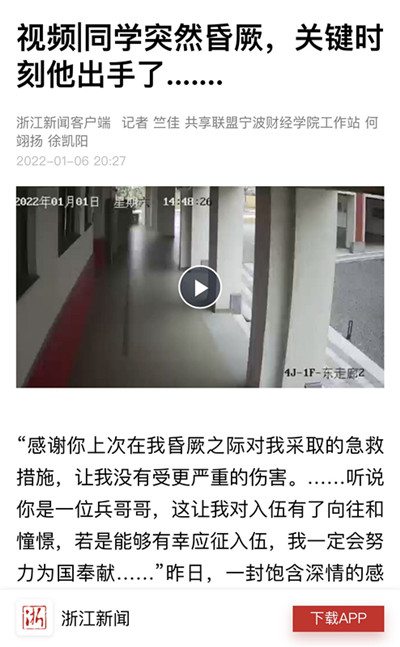 【浙江新闻客户端】同学突然昏厥,关键时刻宁财院小哥哥出手了