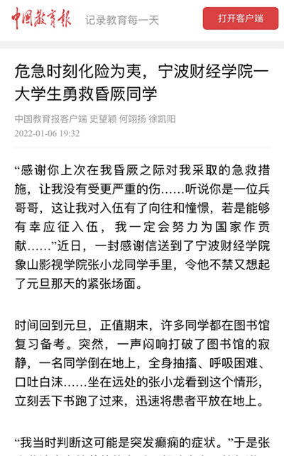 【中国教育报客户端】危急时刻化险为夷,宁波财经学院一大学生勇救昏厥同学