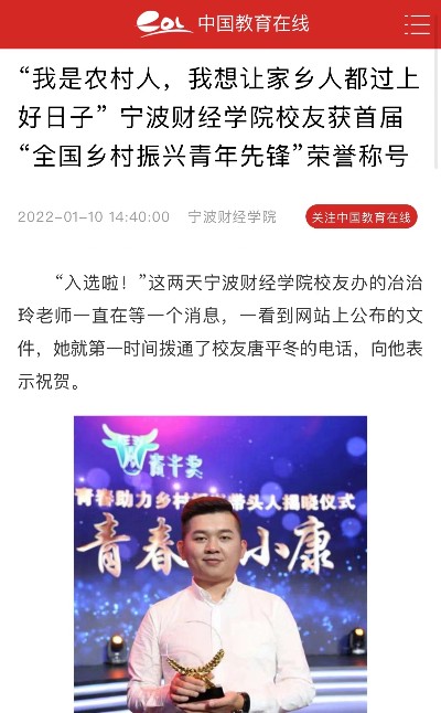 【中国教育在线】宁波财经学院校友获首届“全国乡村振兴青年先锋”荣誉称号