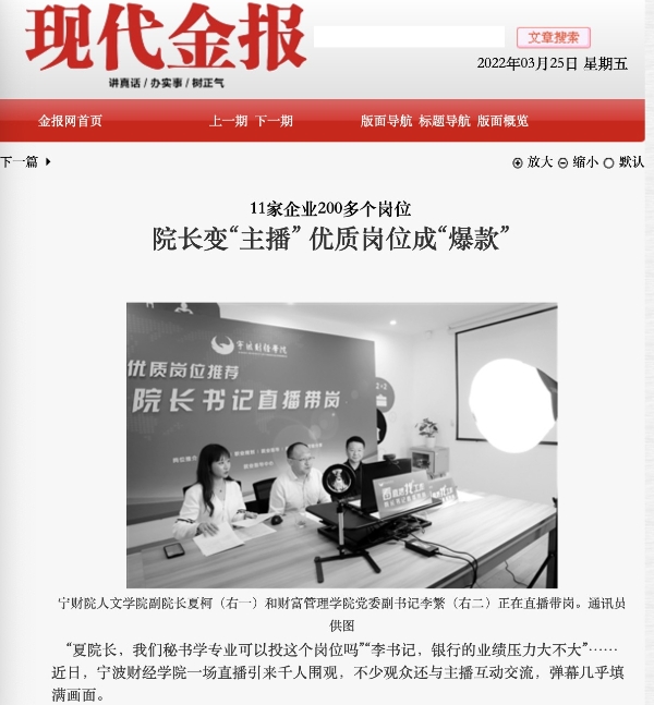 【现代金报】宁波财经学院:11家企业200多个岗位 院长变“主播” 优质岗位成“爆款”