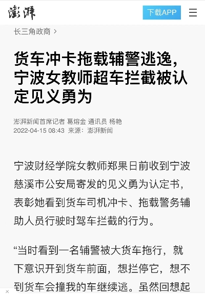 【澎湃新闻客户端】货车冲卡拖载辅警逃逸,宁财院教师超车拦截被认定见义勇为