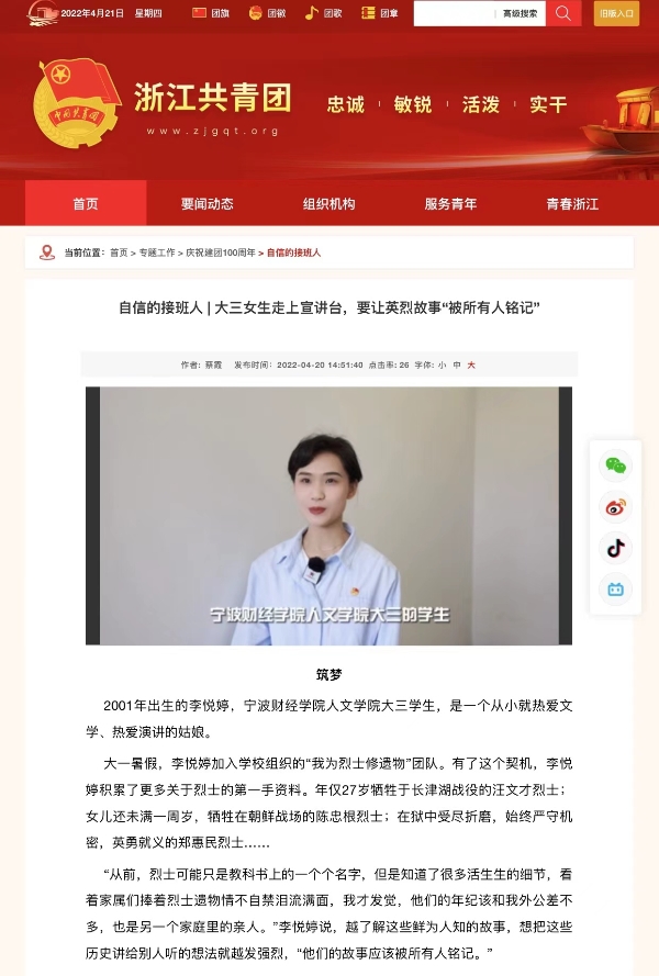 【浙江共青团】宁财院大三女生走上宣讲台,要让英烈故事“被所有人铭记”