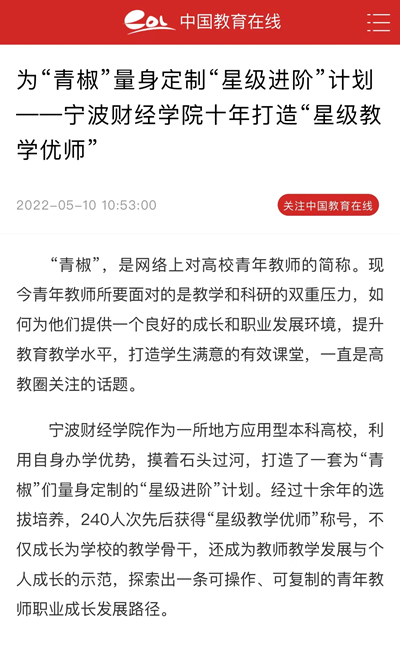 【中国教育在线】为“青椒”量身定制“星级进阶”计划 ——宁波财经学院十年打造“星级教学优师”