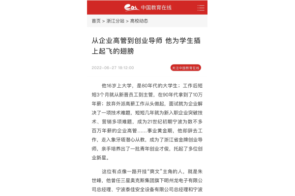【中国教育在线】宁波财经学院朱世峰:从企业高管到创业导师 他为学生插上起飞的翅膀