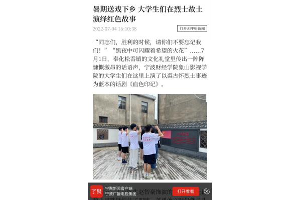 【宁聚新闻客户端】宁波财经学院:暑期送戏下乡 大学生们在烈士故土演绎红色故事