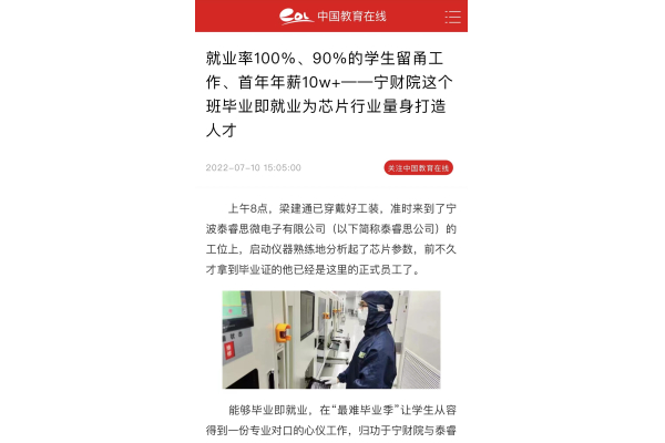 【中国教育在线】就业率100%、90%的学生留甬工作、首年年薪10w+——宁财院这个班毕业即就业为芯片行业量身打造人才