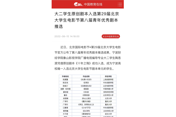 【中国教育在线】宁财院大二学生原创剧本入选第29届北京大学生电影节第八届青年优秀剧本推选