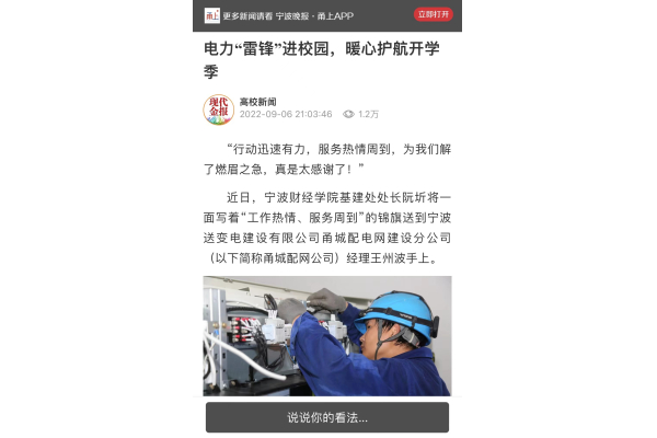 【宁波晚报·甬上客户端】宁财院:电力“雷锋”进校园,暖心护航开学季