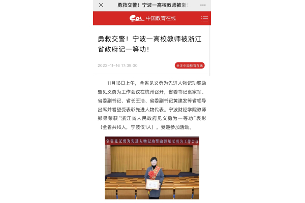 【中国教育在线】勇救交警!宁财院高校教师被浙江省政府记一等功!