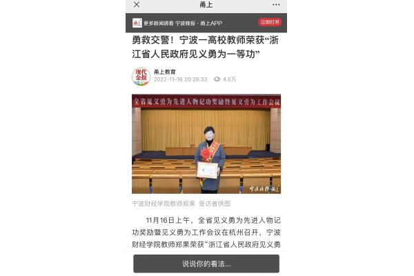 【宁波晚报·甬上客户端】勇救交警!宁财院教师荣获“浙江省人民政府见义勇为一等功”