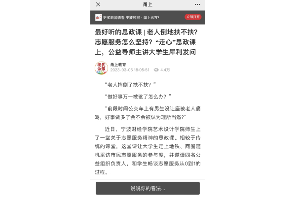 【宁波晚报·甬上客户端】宁波财经学院:最好听的思政课| 老人倒地扶不扶?志愿服务怎么坚持?“走心”思政课上,公益导师主讲大学生犀利发问