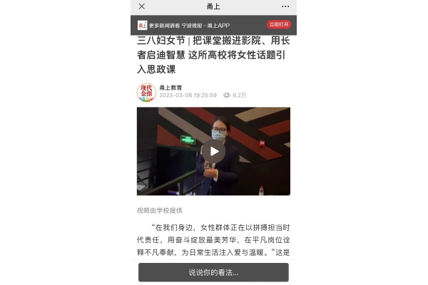 【宁波晚报·甬上客户端】三八妇女节 | 宁财院:把课堂搬进影院、用长者启迪智慧 这所高校将女性话题引入思政课