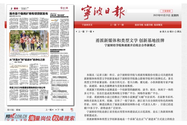 【宁波日报】甬派新媒体和类型文学 创新基地挂牌 宁波财经学院和甬派开启校企合作新模式