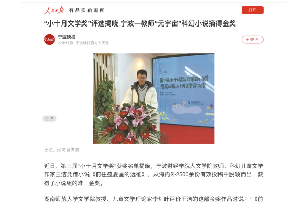 【人民日报客户端】“小十月文学奖”评选揭晓 宁财院教师“元宇宙”科幻小说摘得金奖