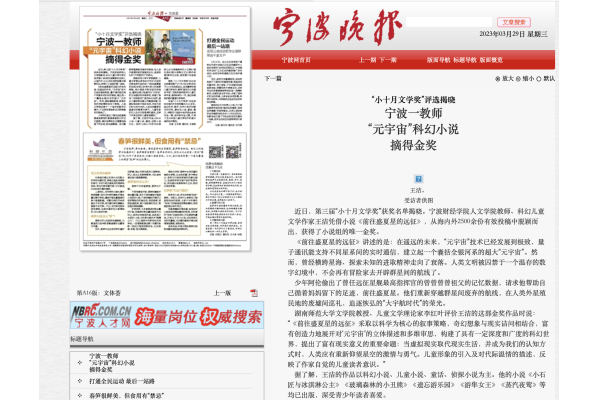 【宁波晚报】“小十月文学奖”评选揭晓 宁财院教师 “元宇宙”科幻小说 摘得金奖