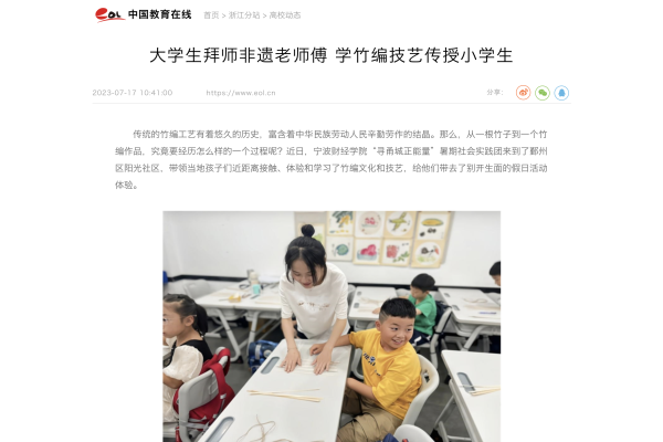 【中国教育在线】大学生拜师非遗老师傅 学竹编技艺传授小学生