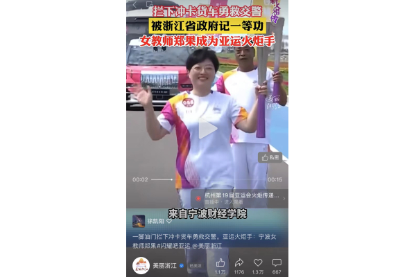 【美丽浙江视频号】拦下冲卡货车勇救交警 被浙江省政府记一等功 女教师郑果成为亚运火炬手