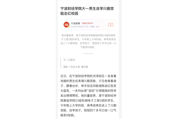 【界面新闻】宁波财经学院大一男生自学川剧变脸走红校园