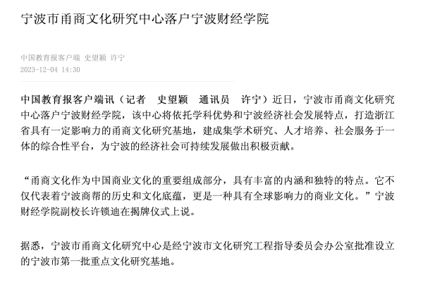 【中国教育报客户端】宁波市甬商文化研究中心落户宁波财经学院