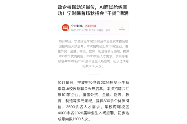 【界面新闻】政企校联动送岗位,AI面试舱练真功!宁财院首场秋招会“干货”满满