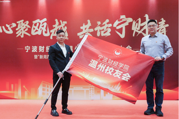 许锁迪为郑天波会长授予会旗。郑天波在发言中表示,未来将努力凝聚在温宁财校友,积极促成校友间实质性合作,不断加强与母校的交流与联动,通过搭建资源共享平台等方式,积极助力母校各项建设工作,以真正实现“校友与母校双向赋能、共同发展”的美好愿景。