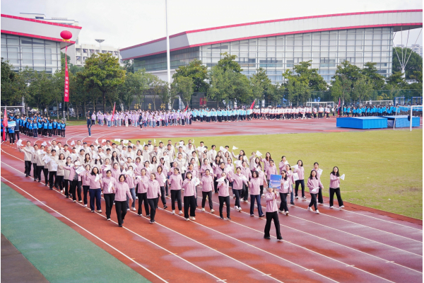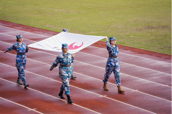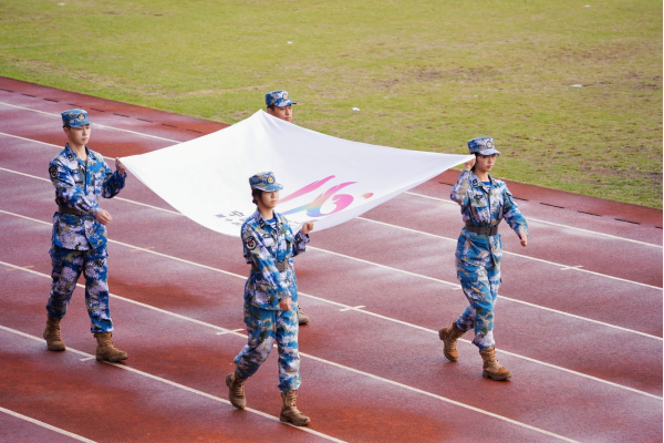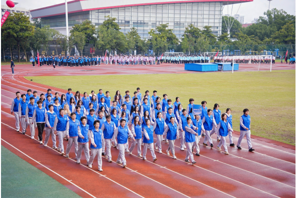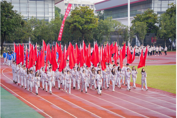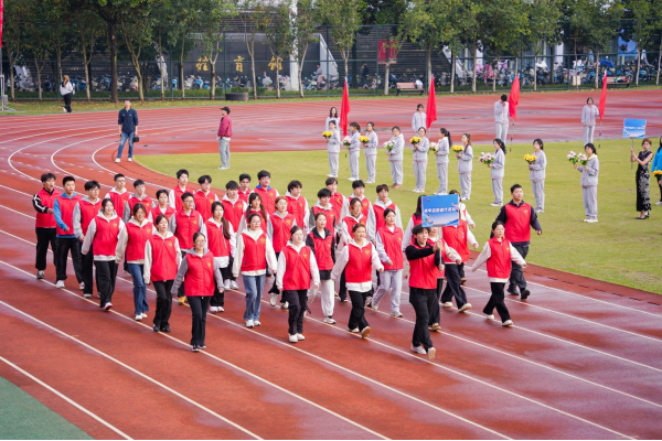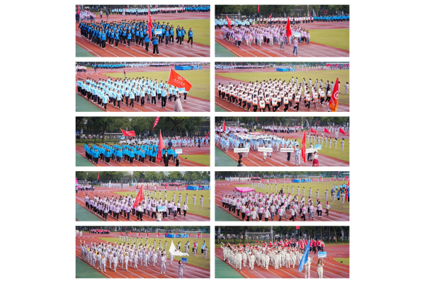 伴着激昂的运动员进行曲,国旗、校旗、运动会会旗、红旗方队,鲜花方队、裁判员方队、青年志愿者方队、教工代表队及各二级学院运动员代表队昂首阔步迈入会场。