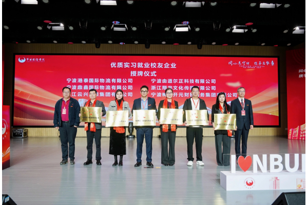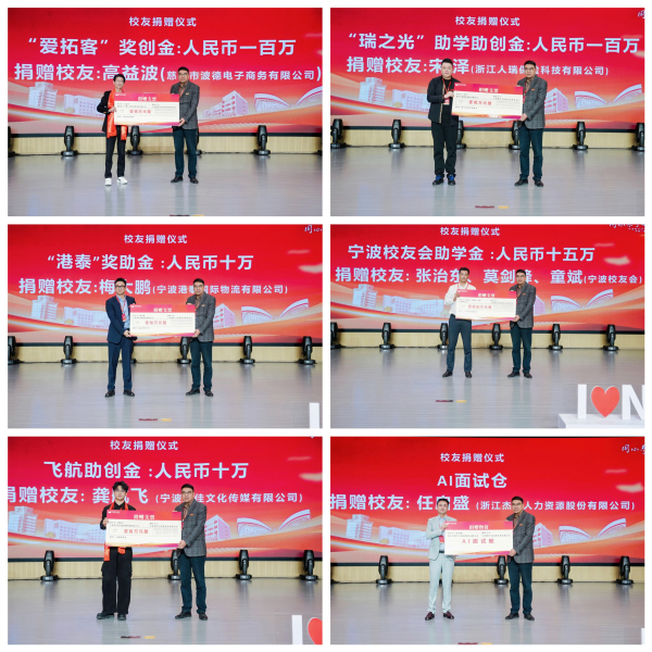在大会的校友捐赠仪式上,高益波、宋泽、梅大鹏、龚航飞、宁波校友会分别向我校教育发展基金会捐赠并设立各类奖助创金,为母校人才培养提供支持;任启盛校友捐赠了AI面试仓,以实际行动助力学子成长。会上,还为宁波港泰国际物流有限公司、宁波鼎鑫国际物流有限公司、浙江云兴文旅集团有限公司、宁波一戈文化创意有限公司、浙江翔龙文化传播有限公司、宁波神州开元财税服务集团有限公司等优质实习就业校友企业授牌,表彰其为我校学生提供优质实习岗位、搭建就业桥梁作出的贡献。