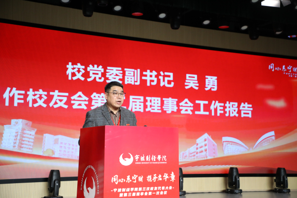 校党委副书记吴勇作第二届校友工作报告。在报告中,他从健全机制建设、推动平台搭建、资源活化开发三个方面回顾了第二届校友会在加强校友会组织建设、完善校友工作机制、强化校友联络服务、促进校友与母校共同发展等方面开展了扎实有效的工作情况,并从以校友为本一体化统筹推进校友工作、着力推动自身建设内涵式高质量发展、构建学校和校友发展共同体、实施提质增效工程四个方面介绍了未来校友会发展建设规划。