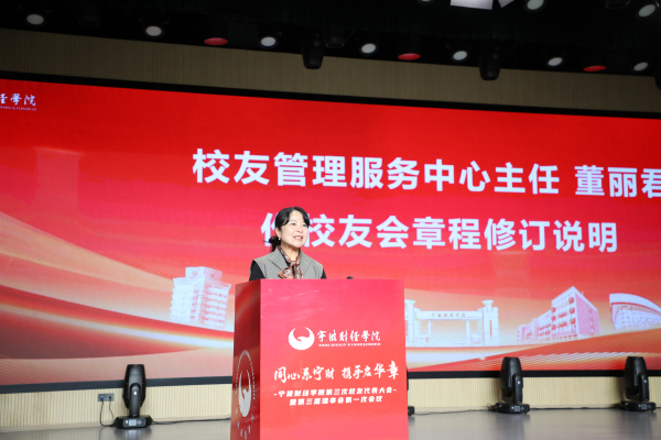 在热烈的掌声中,大会审议通过了《宁波财经学院校友会第二届理事会工作报告》《宁波财经学院校友会章程(2025修订)(草案)》,并审议产生了第三届理事会理事名单。