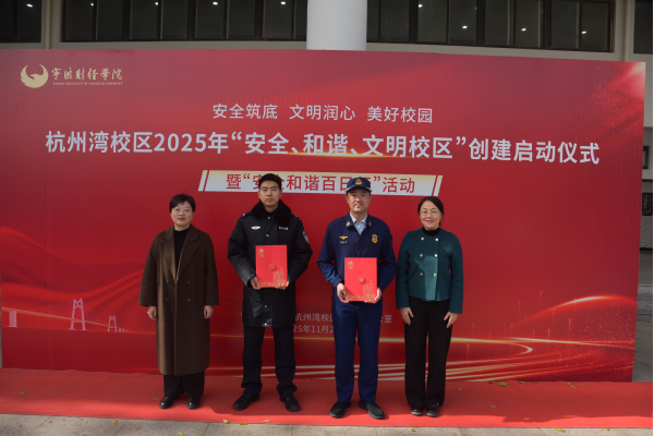 11月27日上午,为深化“等级平安校园”建设,营造安全、和谐、文明的育人环境,杭州湾校区举行2025年“安全、和谐、文明校区”创建暨“安全和谐百日行”活动启动仪式。前湾派出所副所长俞奇威、前湾新区消防救援大队大桥站政治指导员朱成玉与校区管委会相关负责人、师生代表共同开启为期数月的创建行动。杭州湾校区党工委副书记梅友虎主持仪式。