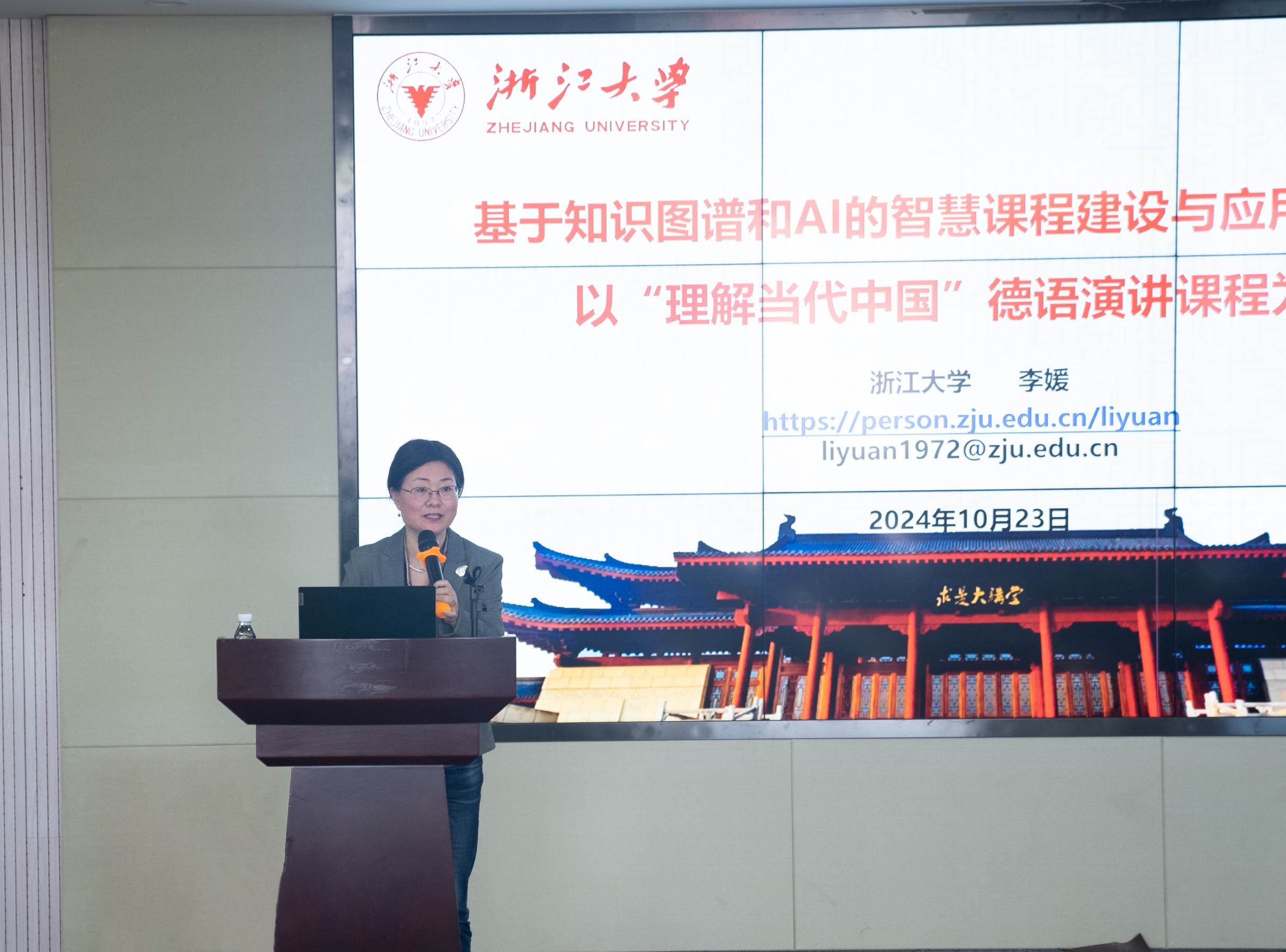 浙江大学外国语学院李媛教授作题为“基于知识图谱和AI的智慧课程建设实践”的专题报告。首先,她解读了国家在推动新一代信息技术与教育教学深度融合方面的政策导向,强调了构建智慧课程的重要性。她详细介绍了知识图谱和AI如何在德语课程教学中发挥作用,通过实际案例分享了她的教学实践经验。她指出,通过构建知识图谱,可以有效地整合语言学习资源,实现个性化教学路径的规划;利用AI技术赋能课堂教学实践,可以对学生的学习行为进行分析,从而提供更加精准的学习建议和反馈。此外,李教授还将科研成果与教学实践相融合,认为知识图谱与AI赋能为教师开展智慧教学实践提供了新的教学思路和方向。