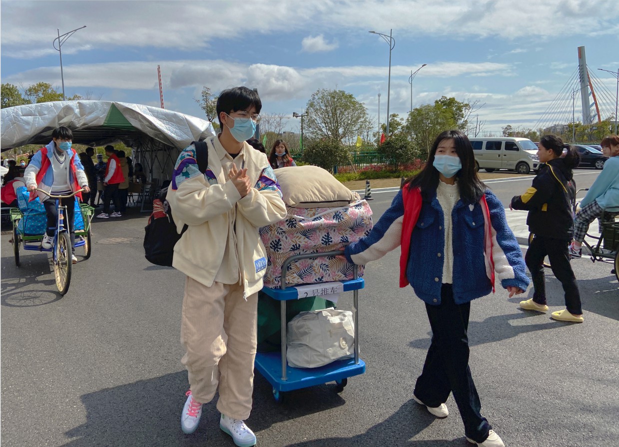 当日一早,学院各相关负责的老师以及学生志愿者都早早来到各场地进行相关的布置以做好迎接自主搬迁同学的准备。为了做好学院疫情防控工作,校门口的志愿者们,主要负责检查同学们的返校申请以及健康码,同时也对每一位进校的同学进行体温检测,同学们也都积极配合志愿者的工作,没有一丝的抱怨与不耐烦。进入校园后,就有引导组和搬迁组的志愿者热情地迎上,他们不仅贴心地把每一位同学带到相应的宿舍楼,还会骑着三轮车帮同学们运送行李。在到达宿舍楼后,大厅和各楼层也有志愿者全程指引、帮忙搬运。各楼层的志愿者们,除帮忙搬行李外,还会带同学们熟悉寝室内的相关情况并对相关宿舍管理条例进行强调与介绍,帮助同学们更好地熟悉新校区、新环境。志愿者们的一条龙式服务让同学们赞不绝口,纷纷表示虽然因为疫情家人无法入校,但志愿者们却让他们感受到不一样的温暖,帮他们更好地融入新的环境。