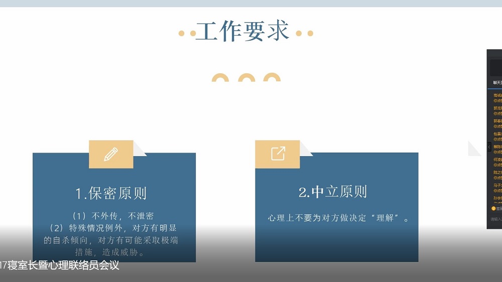 为提高心理联络员发现问题、反馈问题、解决问题的能力,数字技术与工程学院在2022年3月17日中午,召开钉钉线上会议。本次会议由我院心理负责老师袁冰洁主持,三四级心理联络员参与会议。