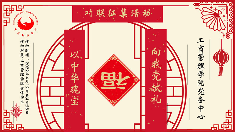 为传承中华优秀传统文化,弘扬中华民族传统美德,4月12日—4月28日,工商管理学院党务中心特开展“以中华瑰宝,向我党献礼”主题对联征集系列活动。此次活动面向工商管理学院全体学生。