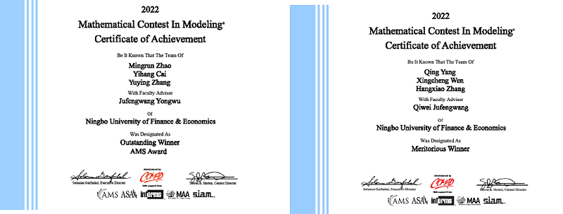 近日,由来自世界22国家地区、27000多支队伍参赛的2022年美国(国际)数学建模大赛成绩揭晓,我院19信管1 班杨丽华、陈倩文, 19金融2 班张硕 ,19金额4班 范艺靖 ,20软工2 班张旭辰、李加航等十余名学生参与的团队,共获得特等奖1项、特等奖提名奖1项、一等奖2项、二等奖3项。我校因此与西安交通大学、武汉大学、哈尔滨工业大学等一起共同荣获美国数学学会冠名奖(AMS奖),成为本届国内非双一流高校获得学会奖的院校之一,也是在甬高校中迄今为止获得的唯一特等奖和冠名奖。