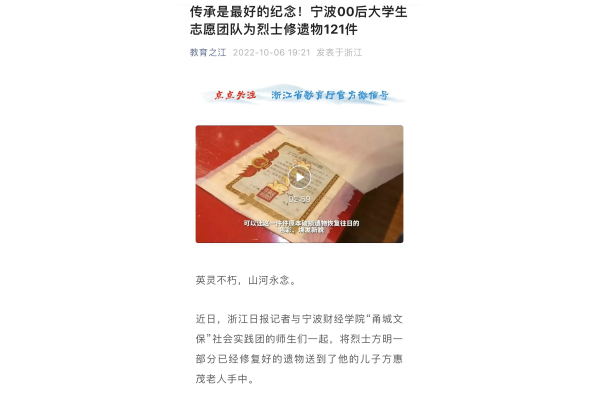 【教育之江微信公众号】传承是最好的纪念!宁财院大学生志愿团队为烈士修遗物121件