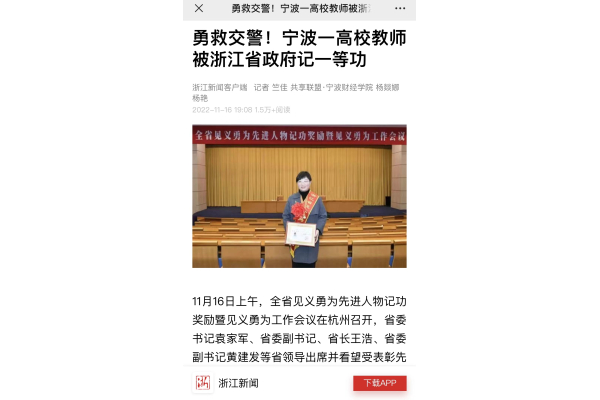 【浙江新闻客户端】勇救交警!宁财院教师被浙江省政府记一等功
