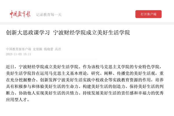 【中国教育报客户端】创新大思政课学习 宁波财经学院成立美好生活学院