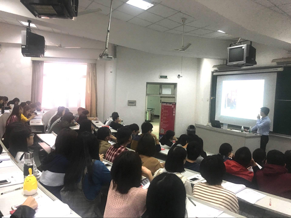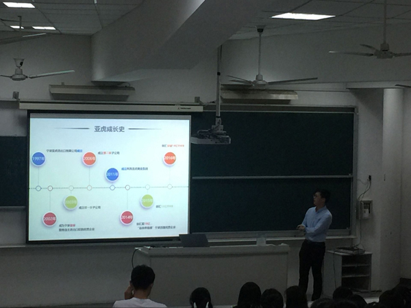宣讲会上,戴总向金贸同学们发表了热情洋溢的演讲。首先,戴总详细介绍了宁波亚虎进出口有限公司的概况,从公司发展史、组织架构、产品优势、企业文化等方面进行介绍,让同学们对公司有了初步了解。随后,戴总重点介绍了亚虎公司的校园招聘政策和人才培养模式,从三大培养模式、薪资福利、成长空间以及工作环境等方面一一列举出应届毕业生选择加入亚虎的诸多好处,并表示亚虎打破外贸企业不招新人的规则,为有梦想、有追求的应届毕业生敞开大门。最后,毕业于宁波大红鹰学院2012级大宗专业的叶德松校友分享了自己与雅虎相遇的故事和入职经历,鼓励在场的同学加入宁波亚虎进出口有限公司,奋力拼搏,努力实现梦想与自身价值!