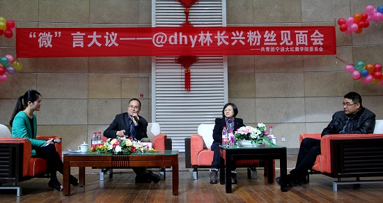 12月14日晚6点半由共青团宁波大红鹰学院委员会承办的“微”言大义——@dhy林长兴粉丝见面会在信息楼报告厅顺利举行。参加此次活动的有校团委副书记林长兴,学生处处长吴勇,学生处副处长劳晓燕和“dhy林长兴”微博的粉丝们。