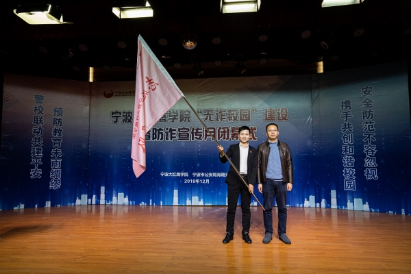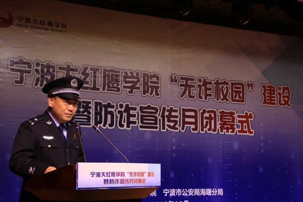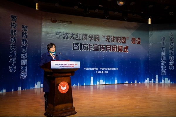 12月27日12时,我校“无诈校园”建设暨防诈宣传月闭幕式在中区小剧场顺利举行。出席本次大会的民警领导有海曙分局党委委员副局长任建明,高桥镇党委副书记叶夏凯,高桥镇党委委员、高桥派出所所长崔磊,公安代表高桥派出所教导员周伟;出席本次大会的校领导有宁波财经学院校长助理何秋叶老师,宁波财经学院保卫处处长陈盛老师,宁波财经学院宣传部副部长葛红军老师,宁波财经学院学生处副处长熊红斌老师,宁波财经学院保卫处副处长徐雁峰老师,宁波财经学院团委书记张海峰老师。