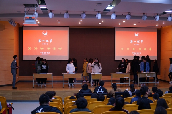 活动主题围绕“弘扬汉字文化,书写美丽人生”进行。进入比赛的第一环节,音译推字。在本轮环节中,每组队员需要独立完成写书任务,书写错误则淘汰一人,整个比赛竞争非常的激烈。第二环节为缺文少字,此轮为六进三,晋级的队伍进入下一环节,淘汰的三支队伍即获三等奖。在第二环节结束,比赛现场开展了一个十分有趣的互动环节——读生僻字送小礼品,该互动环节将整个活动氛围推到了高潮,观众积极举手呼声一片。大部分同学都熟练掌握生僻字的读音和释义,这充分体现了他们对中国文化深深的热爱和为之骄傲的自豪感。在互动环节之后即将迎来本次比赛的最后也是最激动人心的环节即决定冠军花落谁家的推断成语环节。本环节以抢答的形式开展,各组根据PPT上的解释推断写出并成语进行抢答,成语及书写正确的团队加10分,错误则不加分。经过紧张而激烈的比赛,最终,来自18国商2班的共同读书共同进步小组获得了本次比赛的冠军。