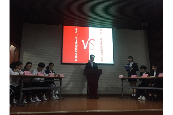 在随后的攻辩环节中,双方更是争锋相对、步步紧逼。两支队伍的同队辩手都互相配合默契。他们妙语连珠、当仁不让。他们旁征博引,将整个比赛带入了一个又一个高潮。正方指出专才紧跟社会,专在于精,专才更适应社会竞争。反方认为,专才建立在通才的基础上,并且通才灵活多变,通才更适应社会竞争。