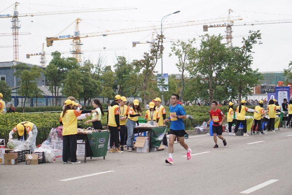 我校学子充分发挥志愿者奉献精神,1200余名志愿者踊跃报名,经过前期动员和专业培训,当日清晨,志愿者们穿上服装,背上补给包,准时来到集合点,在工作人员的带领下有序登上公交车,并在不同功能区为参赛选手提供食物饮品并为选手们呐喊助威。志愿者们在运动员跌倒或受伤的情况下,及时上前询问并协力救助,展现出我校志愿者的热心与精神风貌。补给品作为彼此交流的纽带,从志愿者手中化作前进的力量,激励着参赛者坚持到最后。
