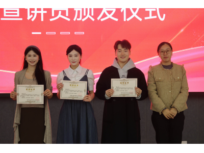 理论宣讲环节同样精彩纷呈。24播音3班邱启萌同学以《从台州到象山:00后眼里的“共富山海经”》为题,分享了青年视角下的共富实践与思考;24播音2(专)班陆子嫣同学则以《一路向北,答案就在风里》的激情宣讲,带领大家领略了象山绿色发展的“追风之路”,传递了青年对地方发展的深切关注与责任担当。活动的重要环节是理论宣讲团的传承仪式。老团长季誉恒同学分享了在宣讲团的成长经历与感悟,新任副团长彭俊航同学表达了接续奋斗、实干笃行的决心。在庄重的授旗仪式中,季誉恒同学将象征着责任与使命的团旗正式授予新任接班人彭俊航,标志着宣讲团精神与事业的薪火相传。随后,张恩茂老师为宣讲团成员颁发了聘书,张明珠老师为优秀宣讲员颁发了荣誉证书,鼓励他们再接再厉。