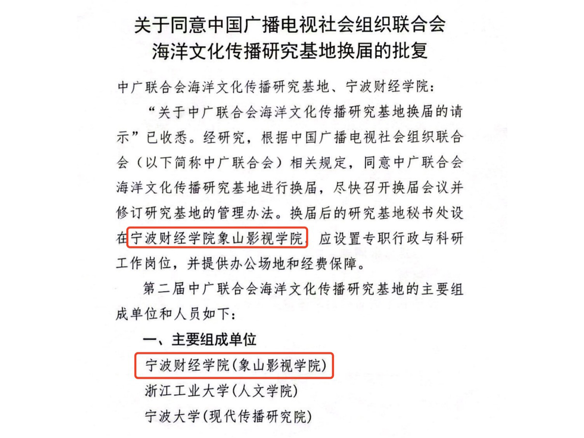 中国广播电视社会组织联合会近日批复同意 海洋文化传播研究基地 换届。根据批复文件,换届后的研究基地秘书处将设在宁波财经学院象山影视学院。 作为研究基地的主要组成单位...